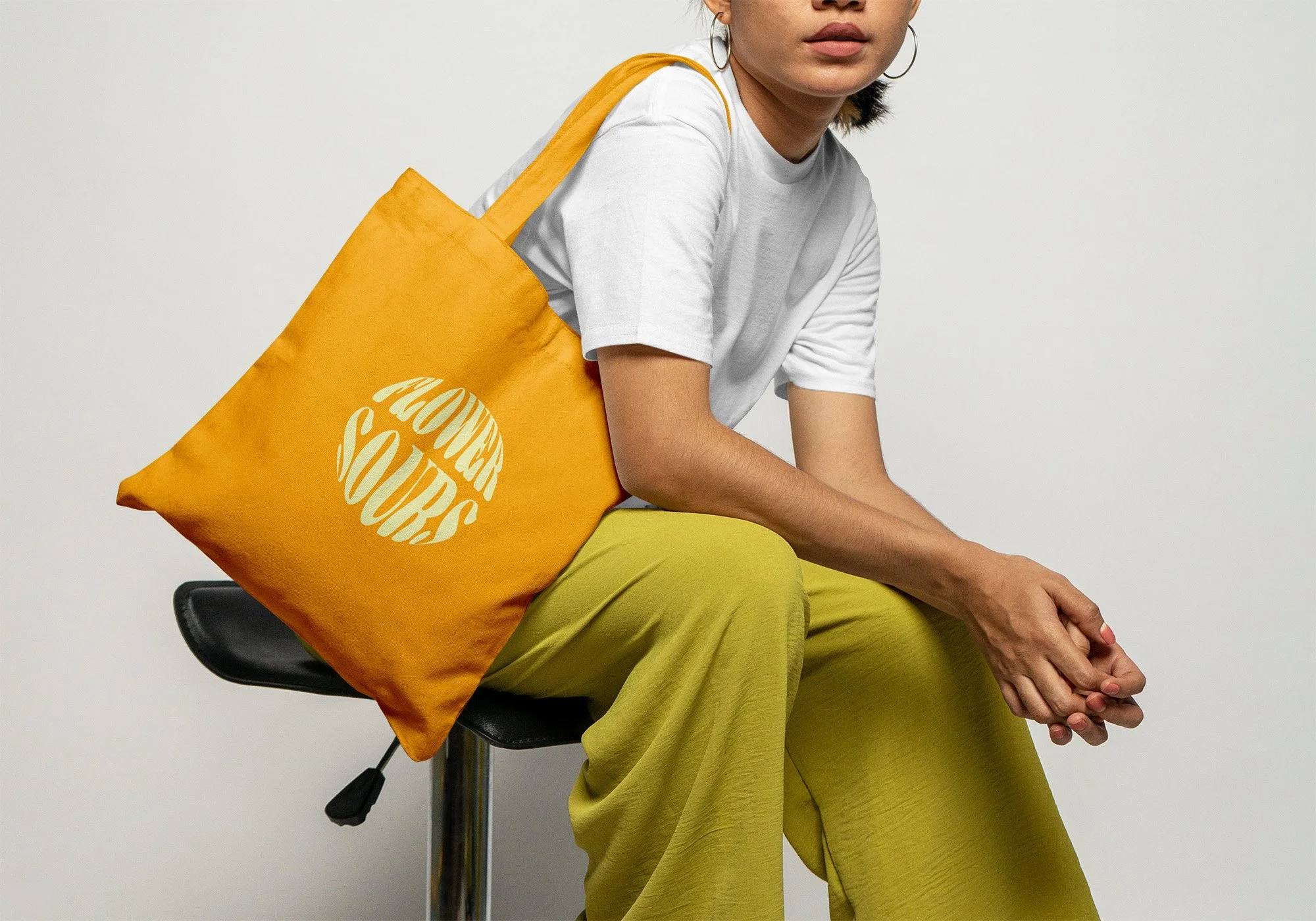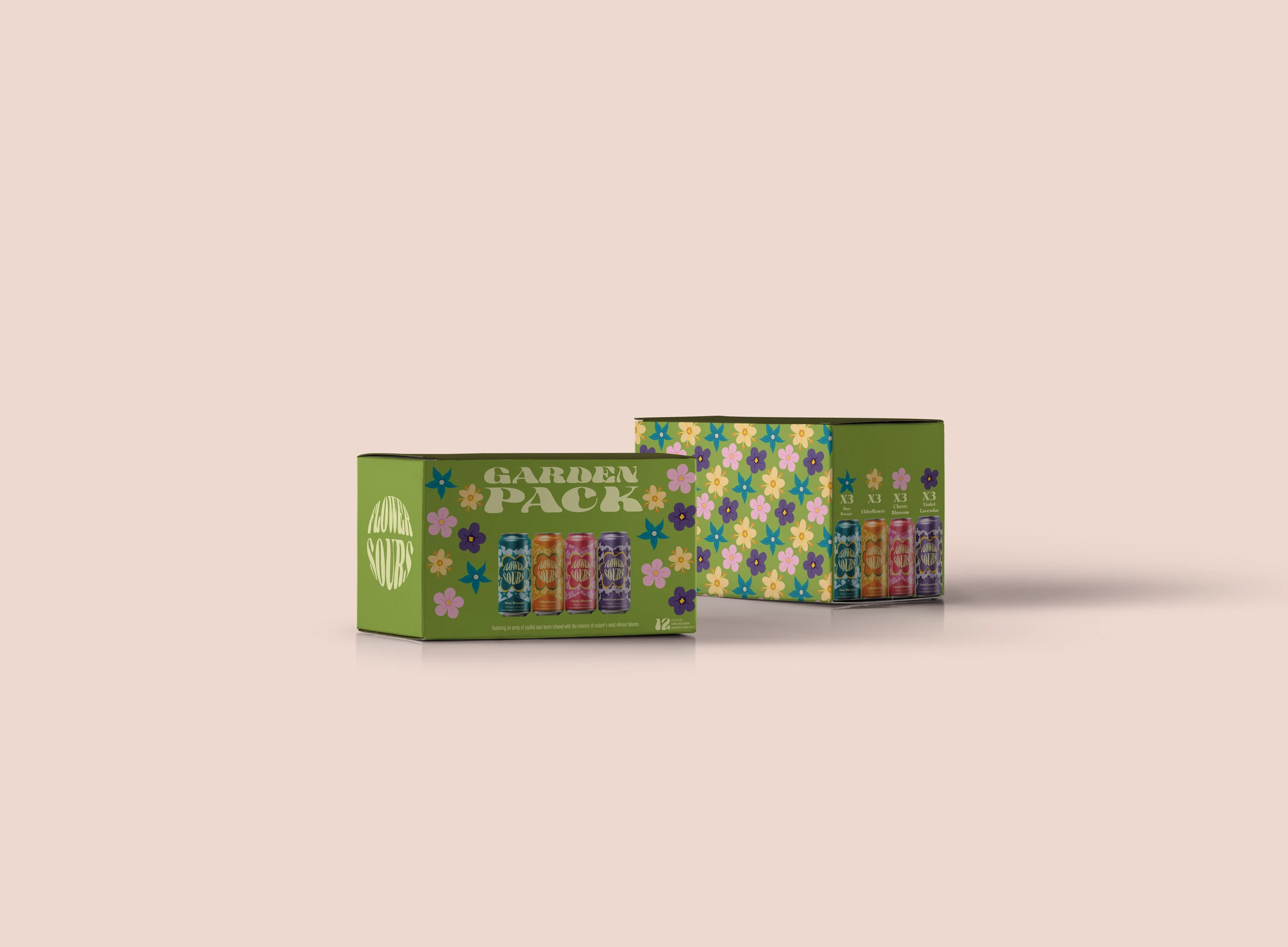 The Flower Sours brand extends across merchandise and packaging through its bold typography and vibrant colour palette. The mixer pack unifies all flavours with consistent floral patterns while using distinct colours to differentiate each, creating a cohesive yet varied shelf presence.